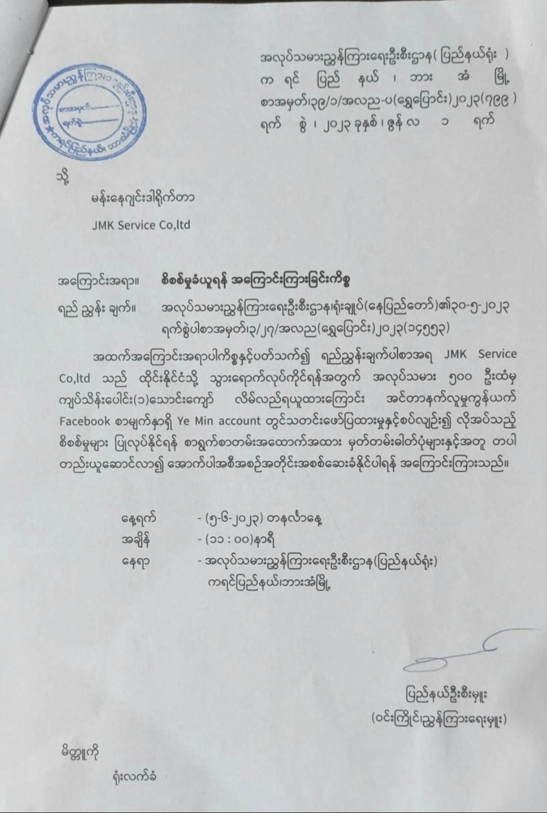 ထိုင်းကို ပို့ပေးမယ်ဆိုပြီး အလုပ်သမားများထံကနေ ငွေကြေးတွေ လိမ်လည်မူဖြင့် JMK အေဂျင်စီကို အလုပ်သမားရုံးက ခေါ်ယူတွေ့ဆုံ