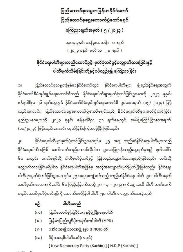 NLD၊ SNLD အပါအ၀င် ပါတီပေါင်း ၄၀ကို နိုင်ငံရေးပါတီမှတ်ပုံတင်ထားခြင်းမှ ပယ်ဖျက်၍ ပါတီများအား ဖျက်သိမ်းကြောင်း UEC ကြေညာ