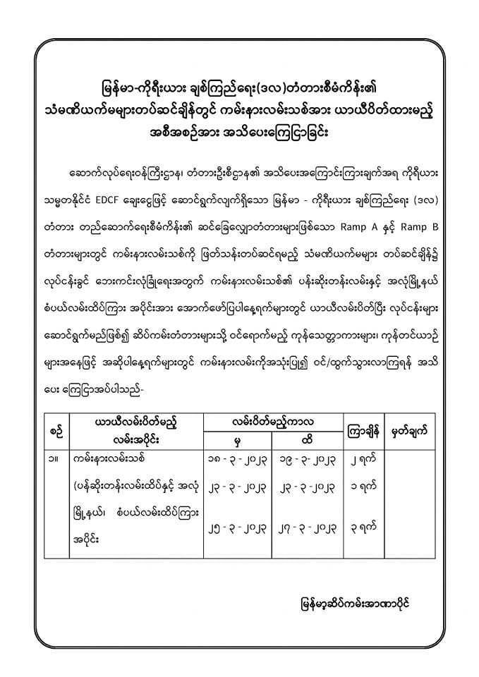 မြန်မာ-ကိုရီယား ချစ်ကြည်ရေး(ဒလ) တံတားစီမံကိန်း၏ သံမဏိယက်မများတပ်ဆင်ချိန်တွင် ကမ်းနားလမ်းသစ်အား ယာယီပိတ်ထားမည့်အစီအစဥ်အား အသိပေးကြေငြာခြင်း