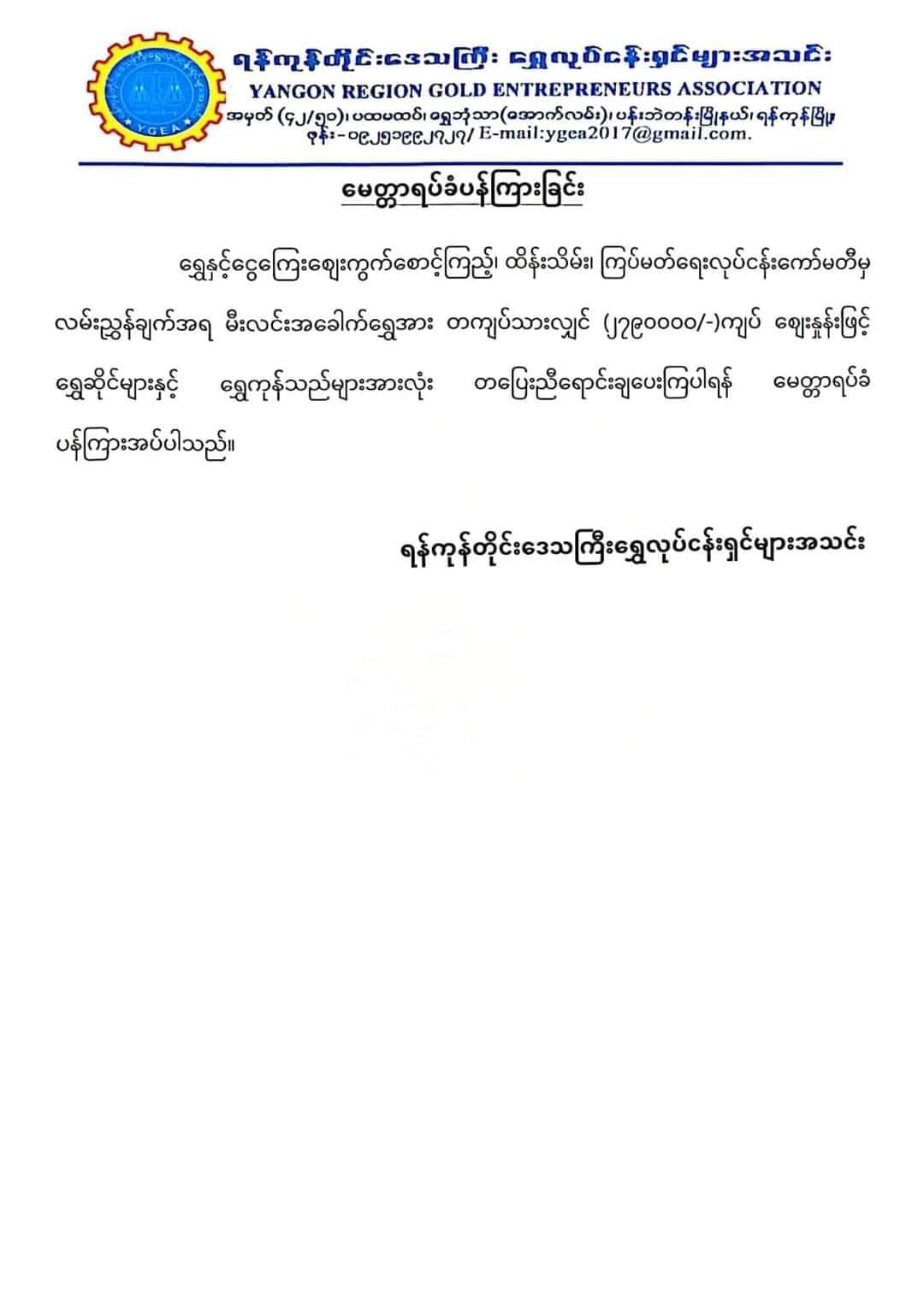 ရွှေတစ်ကျပ်သား ၂၇ သိန်း ၉ သောင်း သတ်မှတ်ကြောင်း YGEA ထုတ်ပြန်