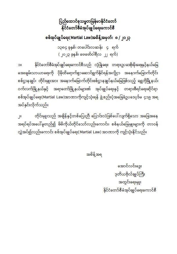 ရွှေဘို၊ဝက်လက်နှင့် အရာတော်မြို့နယ်များကို စစ်အုပ်ချုပ်ရေး(Martial Law) ကြေညာ