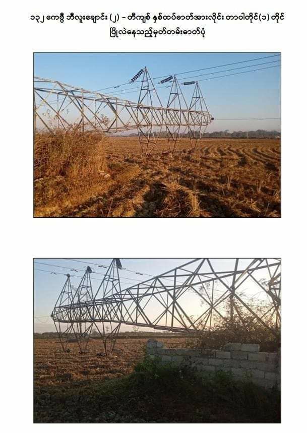 NUG လက်ဝေခံ PDF အမည်ခံအကြမ်းဖက်သမားများမှ ၁၃၂ ကေဗွီ ဘီလူးချောင်း(၂)-တီကျစ် နှစ်ထပ်ဓာတ်အားလိုင်း တာဝါတိုင်(၁) တိုင်အား ဖောက်ခွဲဖျက်ဆီး